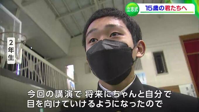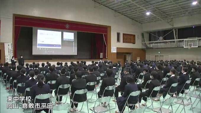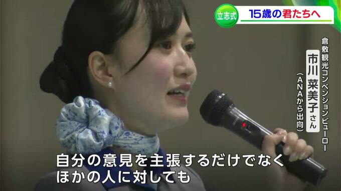 倉敷市立東中学校で開かれた式には、2年生約200人が参加。立志式に招かれた航空会社の客室乗務員らから、大人になって働くことや社会人の心がけなどについての話を聞きました。