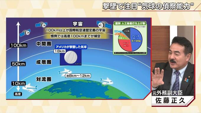 いずれにしても気球について、中国には、複数の研究施設があるようで、人民解放軍も気球の軍事利用に積極的だ。2021年、軍の機関紙『解放軍報』には、「気球は将来、深海に潜む潜水艦のような恐ろしい暗殺者になるだろう」と書かれ、さらに、去年も気球について、“レーダーに感知されにくい” “成層圏に到達して防空兵器を回避できる” “開発の春だ”などと言及している。ハイテク兵器の開発が競われる中で、気球は意外と、有効な存在だと、軍備にも明るい佐藤正久 議員も言う。