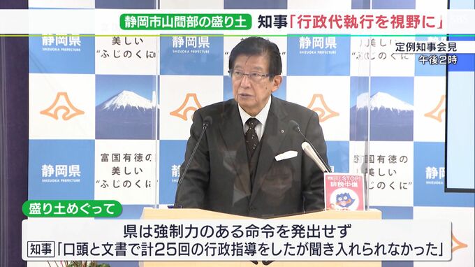 無許可で造成したとして、親子が逮捕された静岡市山間部の2つの大規模な盛り土について、静岡県の川勝平太知事は2月16日、「行政代執行も視野に対応する」と述べました。静岡市葵区の山間部にある杉尾地区と日向地…