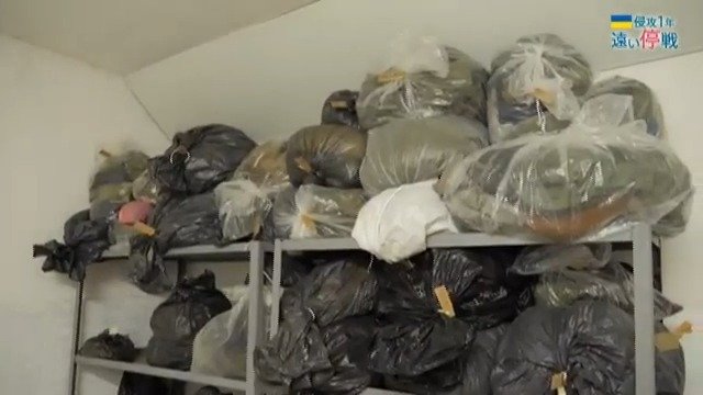 「ちょっと驚きですが、捕虜が身につけていた実際の服。ロシア軍の制服もわかりますね。ここでまず皆さん服を脱いで、危なくないように身につけているものをすべてとると」