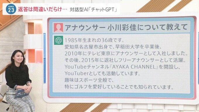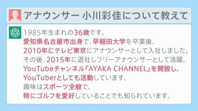 例えば「アナウンサー小川彩佳について教えて」と聞いてみたところ…