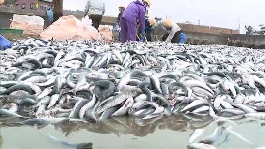 埋め立てられたイワシの量は1立方mの大型土のう袋296袋分(およそ14,800kg)で、幅5mの穴の底にイワシが1mの厚さになったということです。