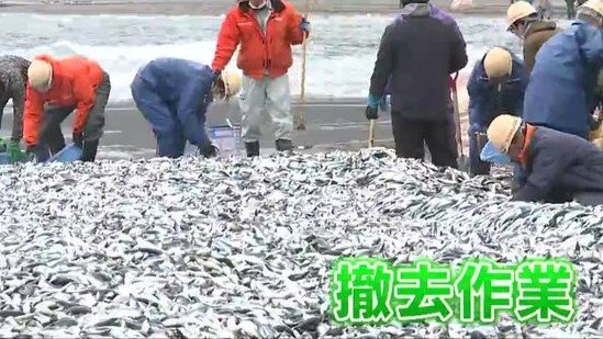 県から委託を受けた業者が50人態勢でイワシを手作業で拾い続け、一部は12日までに新潟県外の飼料加工業者が引き取るとともに焼却処分も行いましたが、砂汚れで焼却炉を傷める恐れもあったため、13日には筒石漁港海岸内での埋め立て処分を決めています。