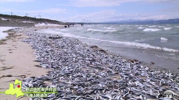 まずはこちら、青森県野辺地町の海岸に漂着したイワシです。16日から海岸線一帯に足の踏み場もないほどの量が打ち上げられていていて住民を驚かせています。むつ湾に面した青森県野辺地町の海岸線沿いに続く漂着し…