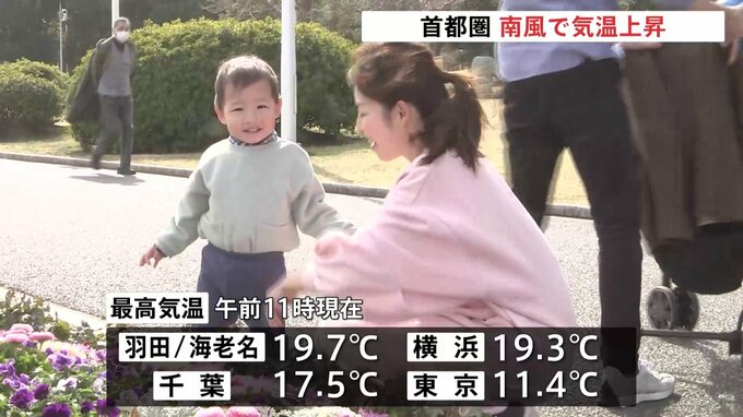 きょうの関東地方は南風が強く吹いている影響で千葉や神奈川などで気温が上昇し、春のような陽気となっています。千葉や神奈川など沿岸部では南寄りの風が強まっている影響で、けさから気温が上昇していて、午前11…