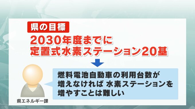 また、県は2030年度までに水素ステーションを20基整備することを目標に掲げていますが、「燃料電池自動車の利用台数が増えなければ、水素ステーションを増やすことは難しい」と県の担当者は話します。