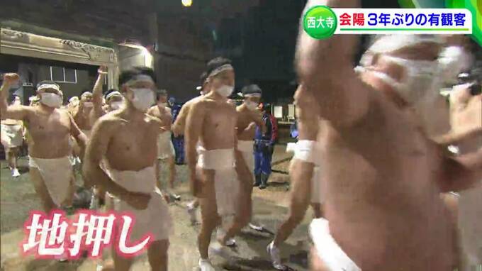 (佐藤大祐記者 リポート)「3年ぶりに、裸の男たちが帰ってきました。境内に威勢のいい掛け声が響いています」