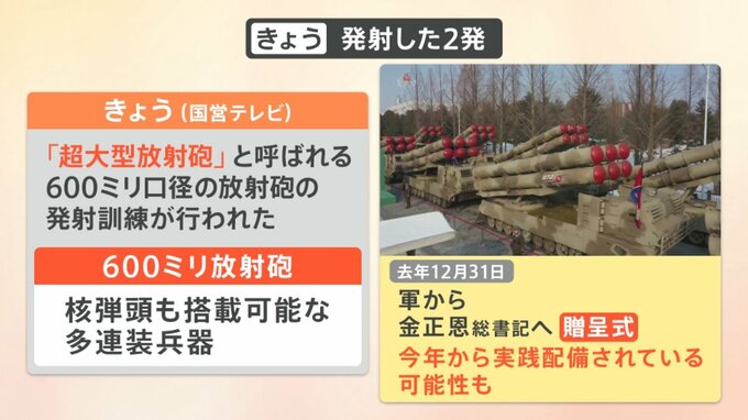 この600ミリ放射砲は、核弾頭も搭載可能な短距離弾道ミサイルということでした。さらにこのミサイルは2022年12月31日に北朝鮮の軍から金正恩総書記へ贈呈式が行われたということですが、2023年から実戦配備されている可能性があるということです。