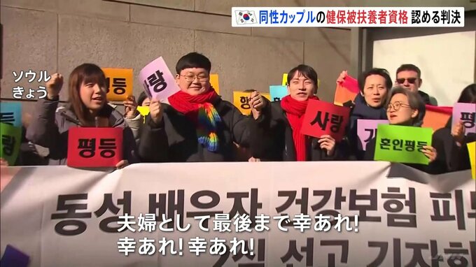 韓国で同性カップルをめぐり、パートナーに健康保険の被扶養者の資格を認めるよう健康保険公団に求めていた裁判で、ソウル高裁は被扶養者として認める判断を下しました。「夫婦として最後まで幸あれ!幸あれ!幸あ…