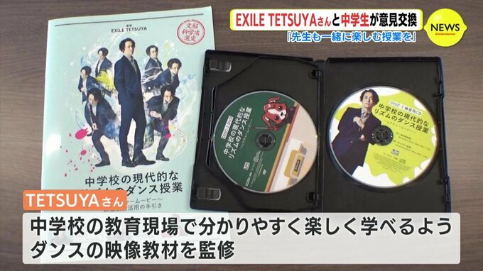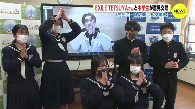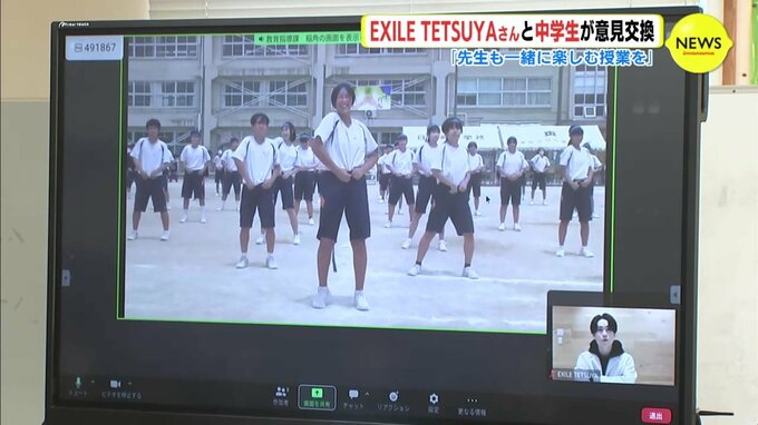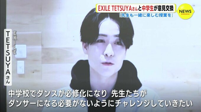 オンラインで意見交換したのは、ダンス&ボーカルグループ「EXILE」のパフォーマー TETSUYA さんです。広島県尾道市にある日比崎中学校の生徒6人と、市内の中学校で保健体育などを担当する教員が参加しました。TETSUYAさんは、中学校の教育現場でダンスをわかりやすく楽しく学べるようにと、ダンスの映像教材を監修しています。