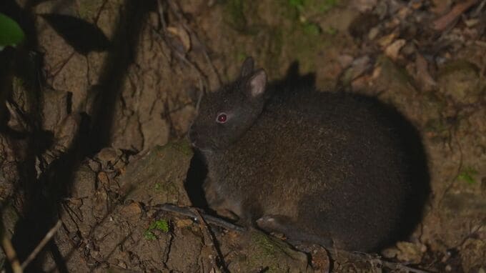 奄美大島と徳之島だけに住む固有種、アマミノクロウサギです。ウサギの特徴の長い耳はなく、ジャンプをすることもできません。