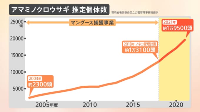 マングースの駆除のみが行われていた2003年~2018年の15年間で増えたクロウサギの数は約11000頭ですが、ノネコ管理計画が始まった2018年~2021年の3年間では約6400頭と、大幅に増加しました。