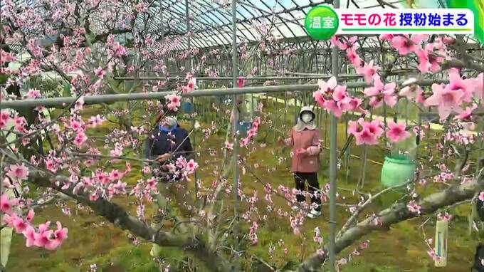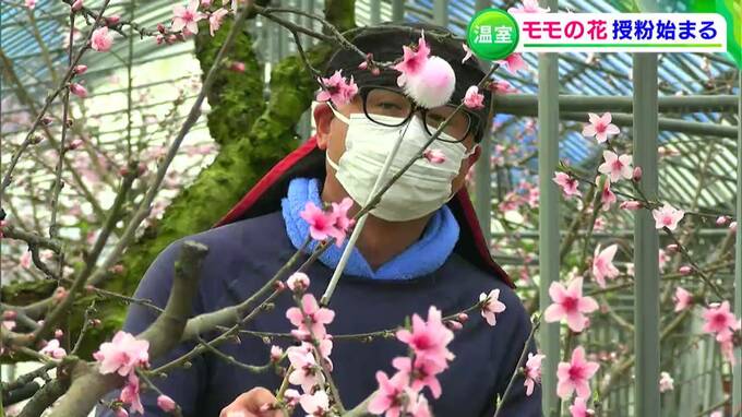 先月の寒波の影響などで今年は品種により開花の度合いにばらつきがあるといいますが、5種類のモモの木34本のうち、6部咲きとなった「はなよめ」を中心に授粉作業が進められています。