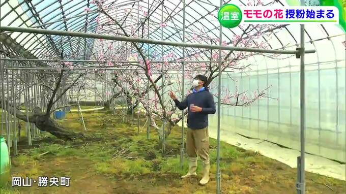 岡山県勝央町で授粉作業が始まりました。「おいしく実ってほしい」と願いを込めながら、一輪一輪、丁寧に花粉をつけていきます。