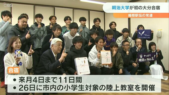 箱根駅伝の常連・明治大学競走部が22日から初めて大分市で合宿をスタートさせました。宿舎では大学OB会の大分支部や父母会6人が出迎え、県産品などを差し入れて選手たちを激励しました。(今年 箱根4区を走った・…