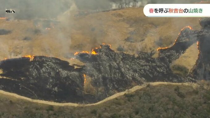 美祢市の秋吉台で早春の風物詩、山焼きがありました。