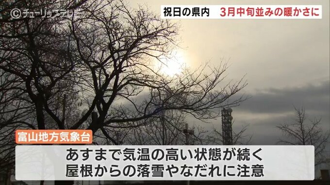 また南風が入る影響で日中は気温が上がり、予想最高気温は富山・高岡市伏木ともに11℃と、3月中旬並みの暖かさとなる予想です。あすまで気温の高い状態が続くことから、富山地方気象台は、積雪が多く残るところでは屋根からの落雪やなだれに注意するよう呼びかけています。
