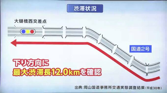 岡山県内を運転するドライバーにとって「渋滞ポイント」として知られているのが、国道2号・大樋橋西交差点です。岡山国道事務所によりますと、1日12万台近くの車が行き交い、朝・夕をピークとして慢性的に混雑する道路で、12kmの渋滞を記録したこともあります。