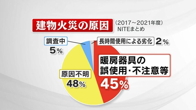 NITE(ナイト)・「製品評価技術基盤機構」によりますと、2017年度から2021度までの5年間でNITEに報告された住宅や店舗などの建物火災のうち、およそ半分が暖房器具の誤使用・不注意等によるものでした。暖房器具が原因の火災は「小さなうっかり」が大きな火災を引き起こすんです。