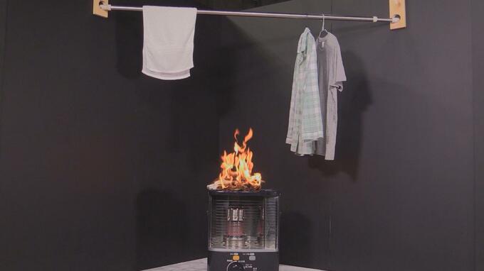 こちらの映像をご覧ください。これは、NITEが行った実験の動画です。洗濯物が石油ストーブの上に落ちてしまいました。すると、落ちた洗濯物からは白い煙が…。洗濯物はその後一瞬で燃え始めました。