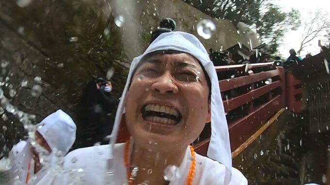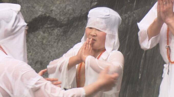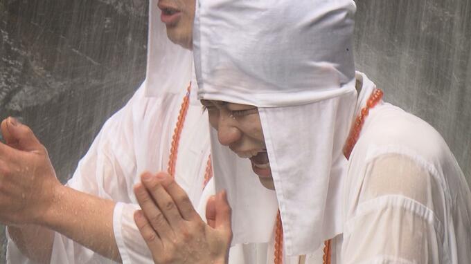 水行には、県内外から8歳から56歳までの男女あわせて34人が参加。気温3度のなか、参加者は白装束を身にまとい、高さおよそ10メートルの滝に打たれながら、無病息災や家内安全を祈りました。
