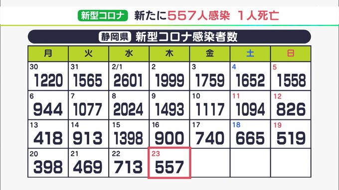 2月23日、静岡県内で新たに557人が新型コロナウイルスに感染したことが分かりました。県内全体で1人の死亡が報告されています。感染者を地域別にみますと、浜松市で117人、静岡市で114人、そのほかの市や町の合計が…