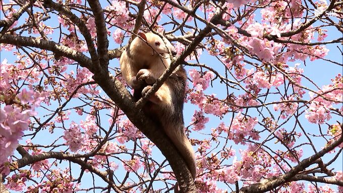 静岡県東伊豆町の伊豆アニマルキングダムで、受験シーズンに縁起のよいイベント、サクラの木から絶対に落ちないアリクイの散歩が行われています。河津桜の木の上でのんびりと散歩を楽しんでいるのは、ミナミコアリ…