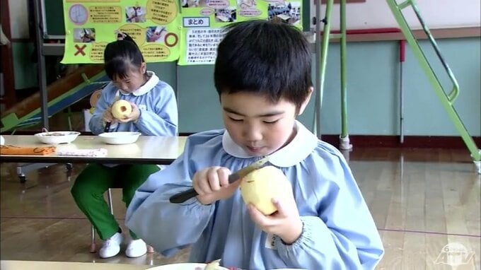 青森県八戸市の幼稚園で園児たちがナイフを使って、リンゴの皮むきに挑戦しました。保護者を前に日頃の練習の成果を披露、なかには1メートル以上つなげてむくツワモノもあらわれました。真剣な表情でリンゴの皮を…