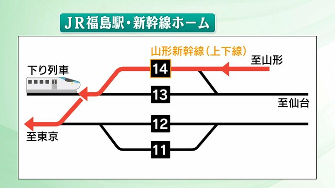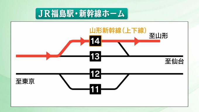 福島駅の新幹線ホームは、11番から14番線までありますが、山形新幹線は、上下線ともに14番線を専用ホームにしています。