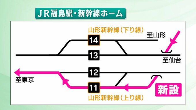 この線路ができることで、山形新幹線の上り線は、そのまま11番線ホームに停車できるようになり、従来のように下りの線路をまたぐことがなくなります。