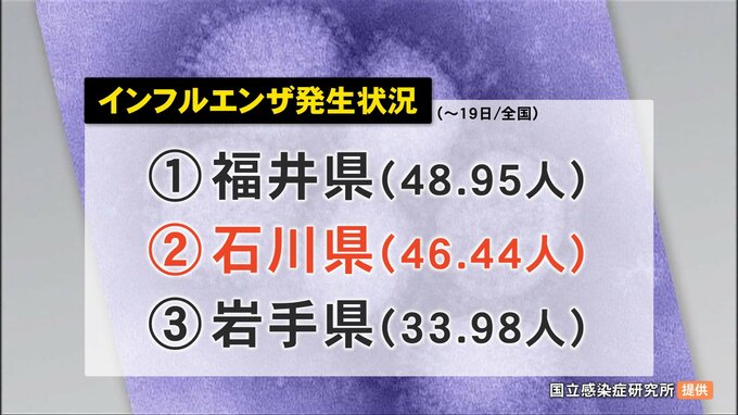 厚生労働省が24日発表した全国の発生状況と比較しても福井県の48.95人に次いで2番目に多い数です。今年は沖縄県から流行が始まっていて必ずしも寒いからとは言えず、石川県に感染者が多い理由について、県も「分からない」としています。