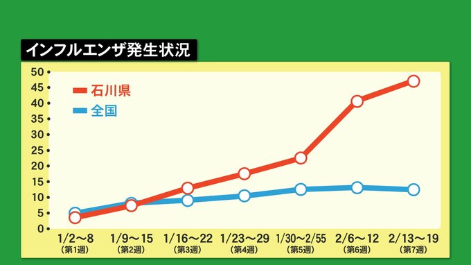 今年に入ってからの推移をグラフにしました。石川県のインフルエンザ注意報は全国的な流行期入りの12月から1か月遅れて先月25日に出ました。以降感染者は急増し、先月から全国平均を大きく上回る事態になっています。