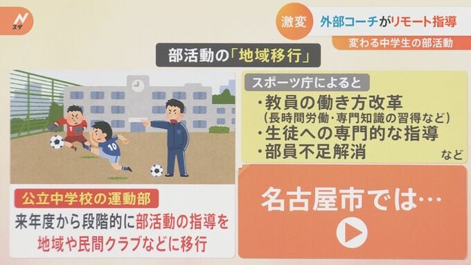 名古屋市では、すでにこんな活動が進んでいます。名古屋市立平針中学校バスケットボール部では、指導が画面越しで行われているんです。実はこれ、別の中学校で指導している外部コーチがリモートで指導しているんです。名古屋市では、このような取り組みで教員の働き方改革、さらに子どもたちにより専門的な指導ができることを期待しているということなんです。
