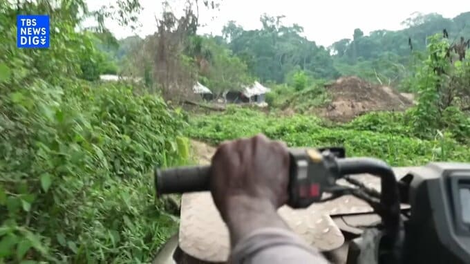 現地には2時間ほどしか滞在が許されないため、違法採掘の現場に向かうよう促された。ここからは、代表が雇っている56歳の作業員が案内するという。彼の顔も撮影不可だ。作業員と取材クルー合わせて4人が、1台の大型3輪バイクに乗る。小雨のなか、ジャングルの奥へと30分ほど走ると、白いテントが見えてきた。バイクを降りて、さらに泥道を歩く。激しいモーター音が聞こえてきた。そこが「金の違法採掘」の現場だった。