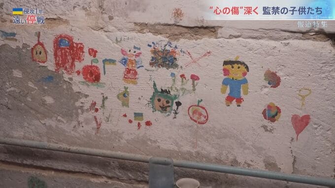 「壁を見ると、子どもたちが描いた絵が描かれています。地下空間で子どもたちも、ずっと監禁されていたんですけど、絵を描いて、何とか子どもたちの心を保っていたということです」