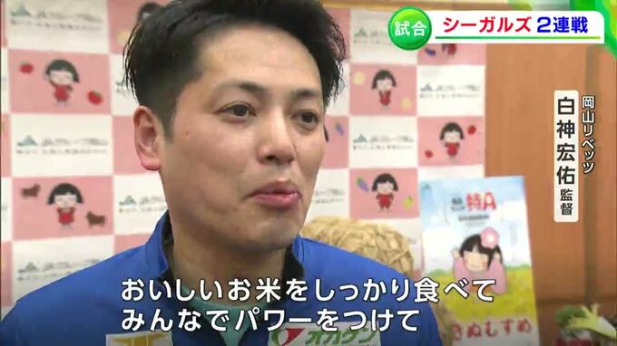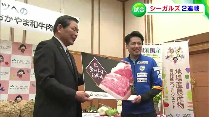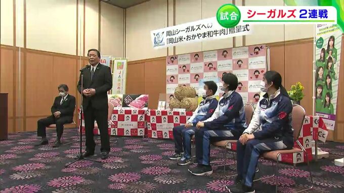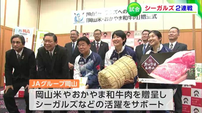 7試合を残して11位と、残留争いをするシーガルズ。なんとか勝ち残ってほしいとJAグループ岡山は特Aを獲得した県産米「きぬむすめ」や、和牛肉を贈りました。