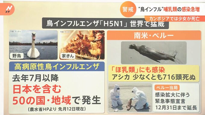 鳥インフルエンザ「H5N1型」の猛威が世界各地で猛威を振るっています。WHO=世界保健機関は、カンボジアで11歳の少女が「H5N1型」に感染し、死亡したことを明らかにしていますが、今後、ヒトからヒトへ感染するリス…