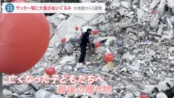 甚大な被害が出たトルコ南部の現地では、がれきの上に赤い風船を飾る男性の姿がありました。