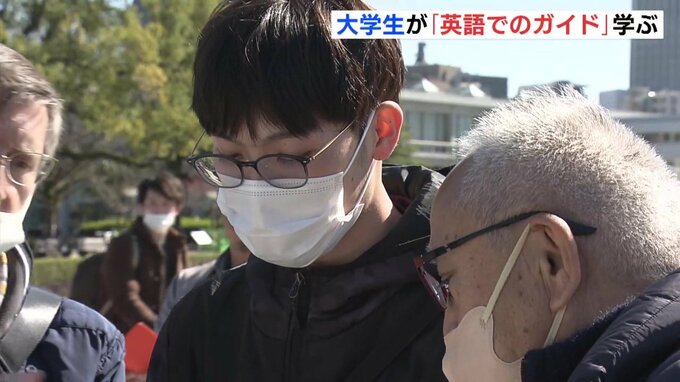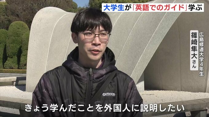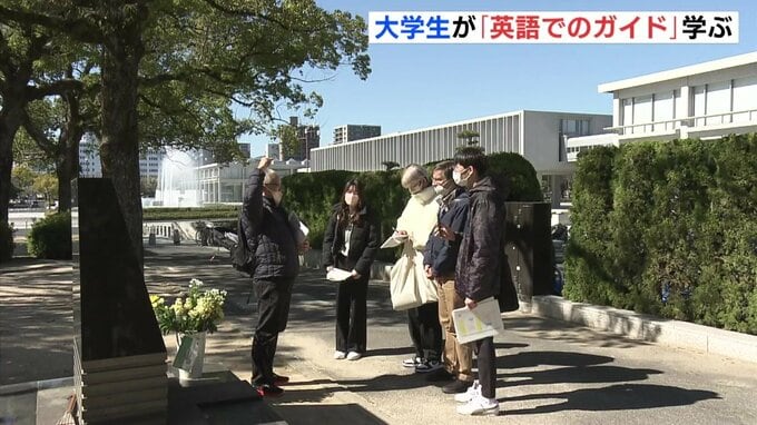広島市の大学生が、英語だけを使って平和公園をガイドするプログラムに参加し、園内の碑巡りを体験しました。