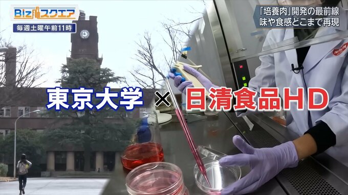 培養肉の研究は大手食品企業でも急ピッチで進んでいる。日清食品ホールディングスは東京大学の研究グループと共同でステーキ肉のような塊の培養肉の開発を目指している。現在は厚さ1mm、6.5×2cm程度の培養肉の開発に成功しているが、これをさらに大きくするための技術開発も進めると言う。