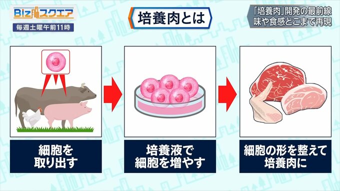 培養肉とは鳥や牛などから取り出した少量の細胞を栄養成分が入った培養液で増殖し、肉の形にしたものだ。動物の細胞を使うことで本来の肉の食感や味に近づけることができるという。