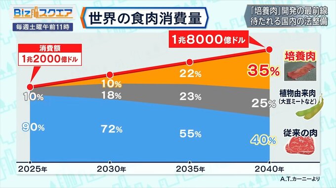 畜産業は今、必要とされる水や餌の多さ、さらに牛が排出するメタンガスなど環境負荷が取り沙汰されている。アメリカの大手コンサルティング会社は、2040年には世界の食肉消費量の35%を培養肉が占めるという試算を発表している。