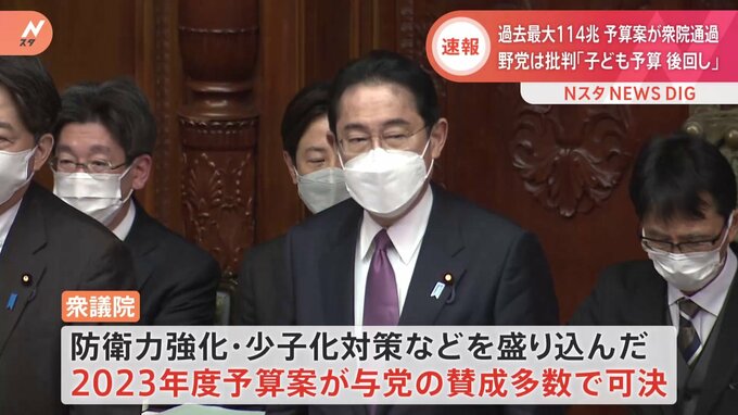 一般会計の歳出総額が過去最大の114兆円を超える2023年度予算案が先ほど、衆議院を通過しました。2023年度予算案は衆議院本会議で採決が行われ、与党の賛成多数で可決されました。立憲民主党 野間健衆院議員「本…