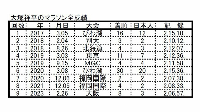 2時間6分台を出せた要因として、大塚自身は「後半の風が気になるほど強くなく、集団の中で力を貯められたから」とレース条件を挙げた。それに加えて大塚が、安定した力を付けていることが大きい。