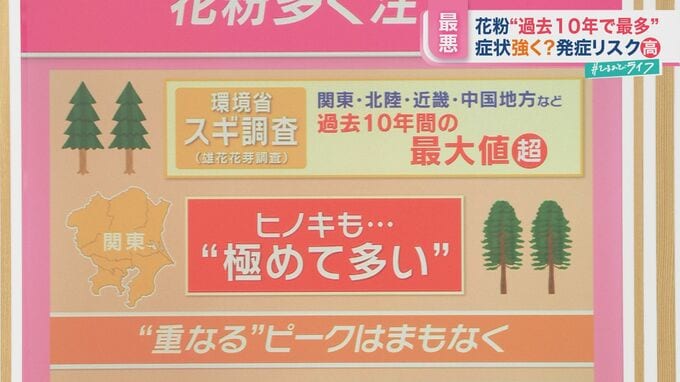 環境省のスギ調査によると、関東・北陸・近畿・中国地方などでは過去10年間の最大値を超えるという予想が出ています。関東ではヒノキも“極めて多い”予想で、これらが重なるピークに備え、対策が必要です。