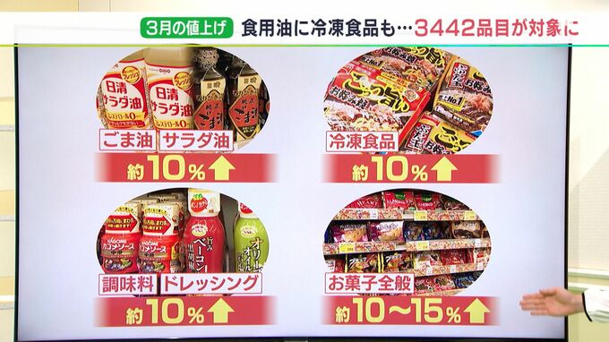 今回、取材した静岡市内のスーパーで、2023年3月中に値上げをする商品の一覧です。▼サラダ油、ごま油…約10%値上げ▼冷凍食品…約10%値上げ▼調味料、ドレッシングなど…約10%値上げ▼お菓子全般…約10~15%値上…