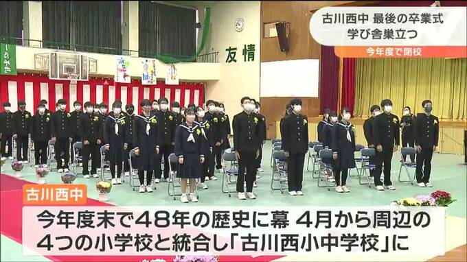 今年度いっぱいで閉校する宮城県大崎市の古川西中学校で2日、最後の卒業式が行われました。卒業生たちが、3年間の思い出を胸に学び舎を巣立ちました。大崎市立古川西中学校で行われた卒業式では、合わせて45人が卒…