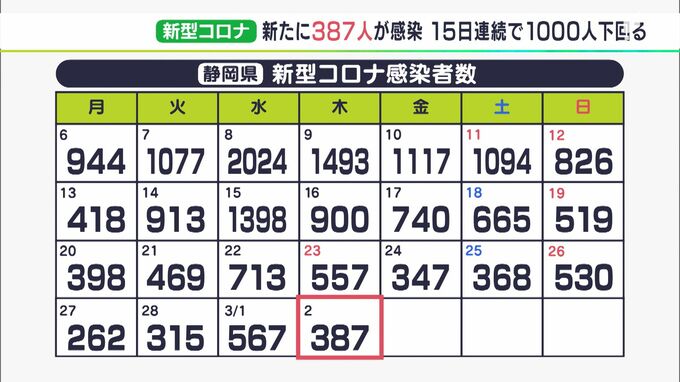 静岡県内では3月2日、新たに387人が新型コロナウイルスに感染したことが分かりました。15日連続で1,000人以下となっています。感染者を地域別にみますと、浜松市で71人、静岡市で108人、その他の市や町で208人とな…