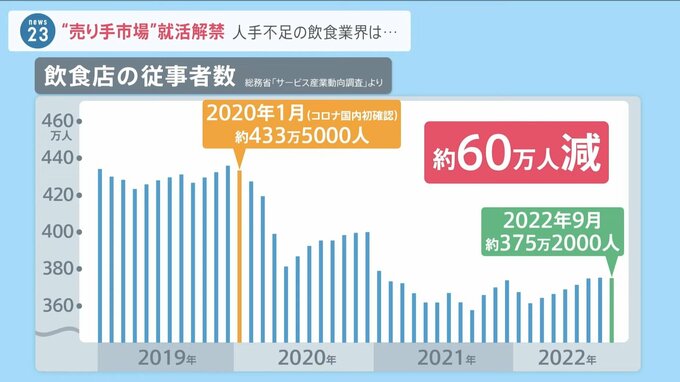 コロナ禍で外食産業は多くの人材が他業種などに移っています。総務省の統計では、飲食店の従事者数は、2020年1月に約433万5000人だったのに対し、2022年9月には約375万2000人と、コロナ前に比べ60万人近く減っています。