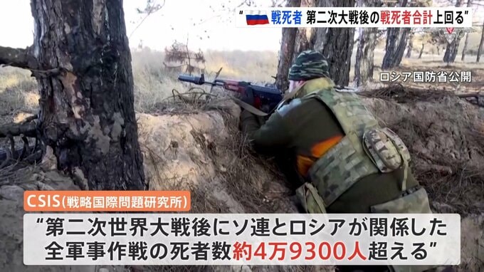アメリカのシンクタンクは、ウクライナ侵攻におけるロシア側の戦死者が、第二次世界大戦後の軍事作戦による戦死者の合計を上回ったと明らかにしました。アメリカのCSIS=戦略国際問題研究所は、ウクライナ侵攻開始…